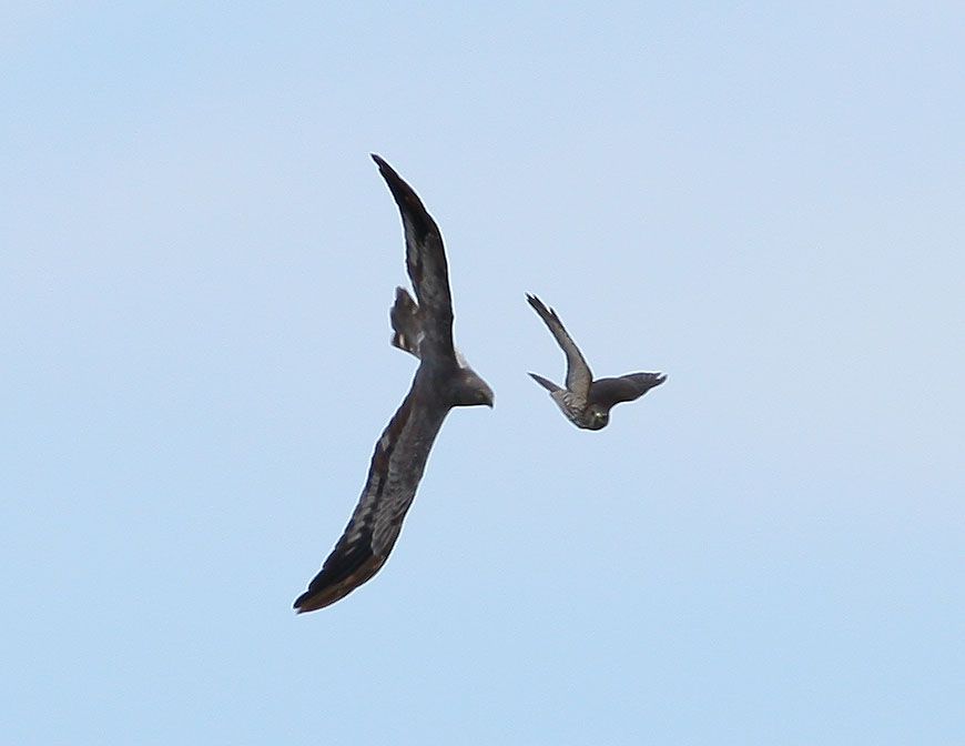Arı şahininin dalaşma anından bir kare..Bu dalaşma yaklaşık bir dakika sürdü.Arı şahini av ararken Küçük olan yırtıcımız arı şahinini taciz etmeye başladı..bir iki tur ,şahin önde küçük olan arkada kovalamaca başladı.Bu görüntüde şahin manevra yaparak,pençelerini kullanmak üzere küçük yırtıcıya doğru temasa hazırlanıyor..Bu kareden sonra temas gerçekleşiyor..Bir kaç it dalaşı manevrasından sonra küçük olan yırtıcı beslenme sahasını terk ediyor..