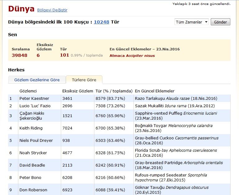 Bugün ebird sitesinde bakınırken dünya listesine göz attım.ilk 100 listesinde Çağan Hoca 3.sıradaymış 6760 tür ile..tebrikler