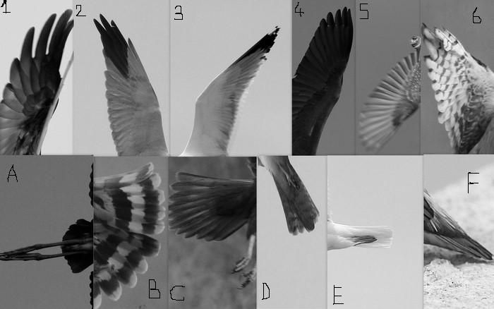 üst tarafta 1 den 5 e kadar sıralanmış olan kanatları aşşaüıdaki A dan F ye kadar sıralanmış olan kuyruklarla eşleştirin ve hangi türü ait olduğunu yazın.... örnek; 3-A (çakır)...değil tabikide...:):):) Zafer ve Akif abiye saygılar..:)