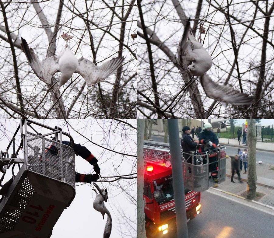 Beykoz a giden caddeyi trafiğe kapatıp merdiveni ağaçlara uzattılar ve martıyı kurtardılar.. Aşağı indiklerinde ise Martının ayağına dolanan misinayı kestik ayaklarında ve bedenin de iğne yada kesik-darbe yoktu biraz sevdikten sonra Martıyı özgürlüğüne! bıraktık..
