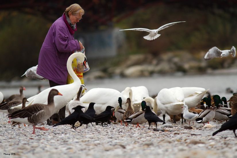 Burası Almanyanın Münih şehri; ortasından Isor nehri geçiyor, insanlar kuşlarla dost. Bir bayan az önce bisikletinden indi, kuşlara yem getirmiş.Yüzlerce kuş bayanın çevresinde; kuğular, kazlar ördekler uçarak çevresini sarıyor. Umarım bizim de kuşlarımız bize yakın olur.