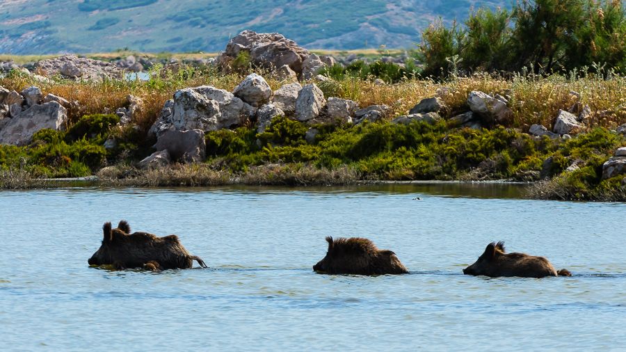 http://Domuzlar İzmir Kuş Cennetinde göleti geçiyorlar. ikinci kare Tarık