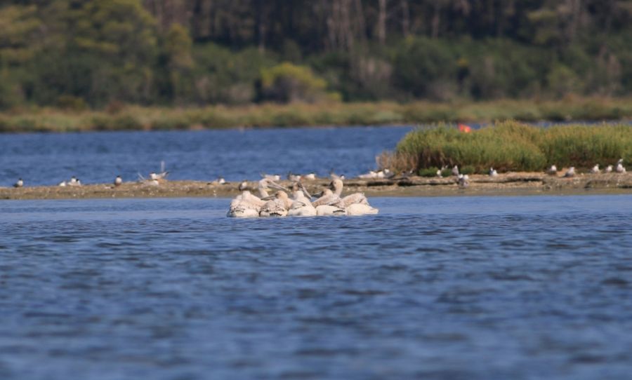 Tepeli Pelikan yavrularının ailelerini beklerken hiç ayrılmamaları çok ilgimi çekti. Sadece 20 m. mesafede 2 ad. büyük Pelikan nöbetçi olarak bekledi. Bu nöbet düzeni nasıl oluşuyor, kimin kalmasına kim karar veriyor anlamış değilim. Akşam büyükler grup grup geldi ve yavruları beslediler.