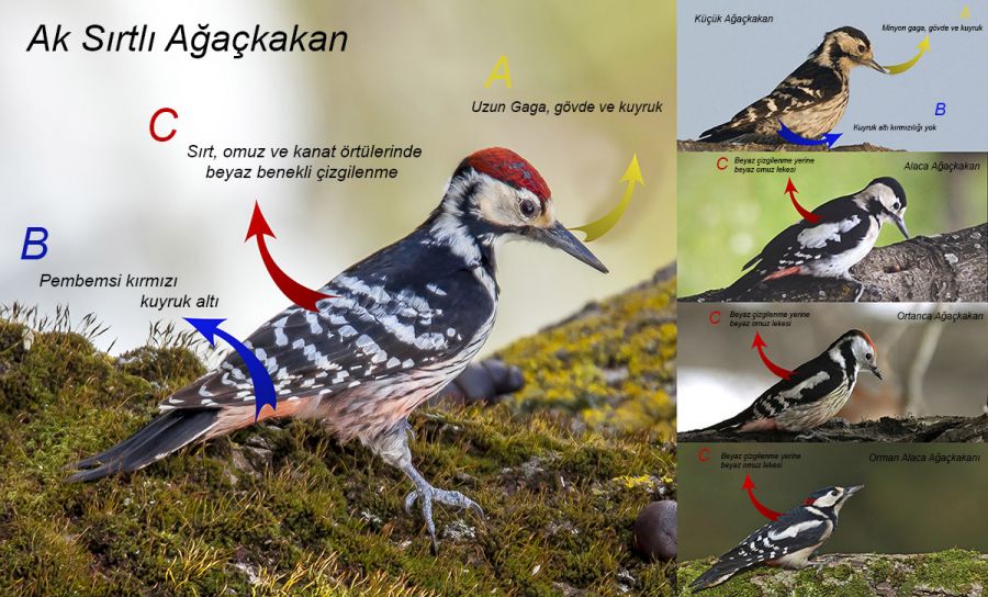 Ak sırtlı ağaçkakan tür sayfası, ayırıcı tanı bölümü içindir. Fotoğraflar: Fotogaleri Küçük ağaçkakan - Ömer Necipoğlu Alaca ağaçkakan - Can Cuditepe Ortanca ağaçkakan - Bora Unver Orman alaca ağaçkakanı - Çetin Çeki Aksırtlı Ağaçkakan - Sabri Pala