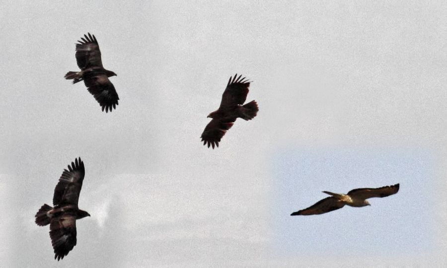 Bugünkü göç gözleminde sona kalanlardan. Sol üçlü aynı birey, sağ alt köşedeki farklı birey. Türleri ne olabilir? 15,00-16,30 arası göçte öne çıkanlar 500 kadar leylek ve 80 kadar arı şahiniydi. Selamlar..