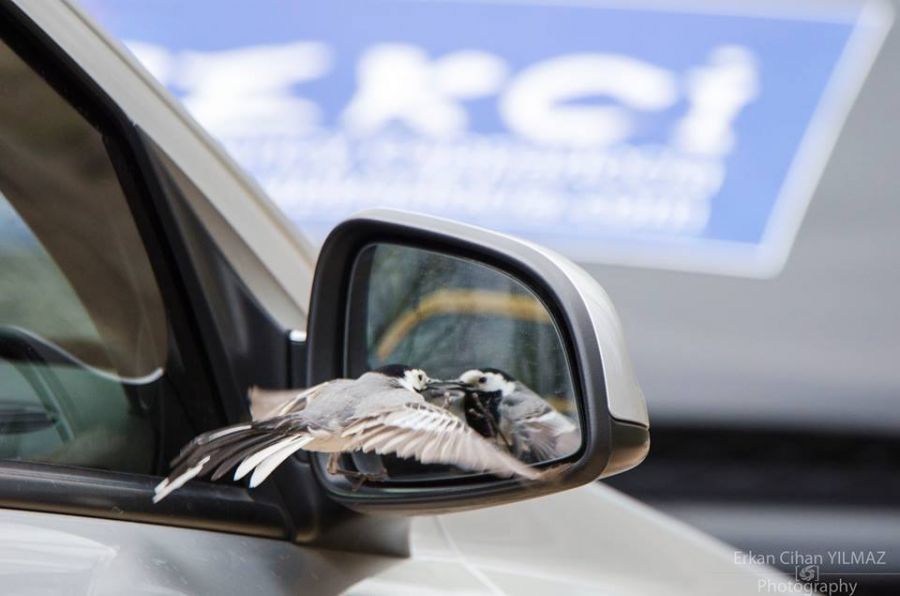 Ankara Fotoğrafçı Topluluğu (Anfot) ile nisan ayında Ihlara vadisine geziye gitmiştik..gezi bittikten sonra parkurun sonundaki restoranda grupça yemek yiyecektik..yemekleri tam söyledik beklerken,restoranın kenarında dere akıyor,derenin hemen kenarında duran otomobilin sağ dikiz aynasının üzerine fotoda görüldüğü gibi kuşun biri konup ardından aynada kendine bakıp duruyordu muhabbet kuşları gibi..ben bunu farkedince herkese seslenerek bakın kuşa dedim..herkes hayretle izledi tabi..fotosunu çekmeye başladılar..bende oturduğumuz yerden kuşun aynaya baktığı belli olmayacağından,kuşun arkasına geçip öyle çekmemiz gerektiğini söyledim.masada oturan erkan arkadaşımızın 150-600 tamronu vardı ve yeni almıştı.bendede canon 75-300 vardı..hem yeni lensi kullanmak hemde daha iyi zoom\'u olduğu için Mücait Topçu (batak) ile arkadaşın (erkanın) makineyi alıp bu kuşu Mücait ile beraber çektik..gezi dönüşü ben erkandan bu fotolardan birini bana yollamasını ve paylaşmak istediğimi söyledim..çünkü makine onun olsada fotoyu çeken bendim..ama arkadaş saolsun 2 tane güzel karenin ikisinide kendi paylaştı ve bana vermedi..hatta teşekkür bile etmedi paylaşırken hatırladığım kadarıyla.sadece fotoyu paylaşıp ismimizi etiketledi bakın fotoyu ekledim dercesine..bende bu çok güzel kareyi çektiğim için biraz zoruma gitti bana verilmemesi..