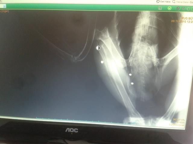 Dünkü puhu fotoğrafımındaki kuş. Bu gün yine arkadaşımın puhu yine burda demesiyle, işi gücü bırakıp geliboluya geçtim Dünki yere yakın bir noktda puhumuz yine oradaydı. Sağlıklı görünüyor ve çok güçlü olsada. uçmaya çalışırken yine biraz ileriye ayaklarının üstüne bir iniş yaptı. Hayvanı tekrar yakaladım ve Çanakkaleye Orman su işlerine oradanda veterinere götürdüm. Çokta yazacak bir şey yok röntgen çekildikten sonra ortaya çıkan manzara bu 8 adet saçma var vücudunda. Antibiyotik başlandı, vitamin verildi. Orman su işlerinin kafesine karanlık bir bölme yaparak hayvanı teslim ettim. Tabi korkudan kimse yaklaşamayınca antibiyotik ve su içirme işlemini yaptım. Koyduğumuz ciğerleri afiyetle yedi. Ama kendimde bir bitkinlik ve yılmış gibi hissediyorum. Çok üzgünüm bunu yapan ve bunun gibi insanlara sanırım daha çok köylere köy kahvelerine avcılık kulüplerine gidip anlatmak daha çok anlatmak gerek. Dün fotoğraflarını çektiğimde de vurulmuş olduğu böylelikle ortaya çıkınca fotoğrafı kaldırdım. Ben ona yardım ettim ve oda bana poz verdi diye sevinirken bu gün tekrar bu yaşananlar çok moral bozucu. Ulna ön kol kemiğinde uçları ayrılmamış bir kırıkta var onun kaynaması için 20-30 güne ihtiyaç varmış. Ve beslemeye enerjisini kaybettirmemeye gayret edeceğiz. Veteriner ile uzun bir görüşme yapıp yapmamız gerekenleri öğrendik. Umarım iyileştiğinde onu tekrar doğaya salarken bir kaç fotoğraf yine alabilirim. Benim için ve diğer tüm trakuş ailesi için hayvanın sağlığından çok sonra fotoğrafını çekmenin geldiğinden eminim. Benim içinde bu böyle. herkese selamlar.