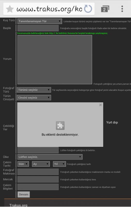 Hepimizin bildiği üzere telefondan galeri,tür ekle ve ff dan siteye fotoğraf atmak istediğimizde ikinci fotoğraftaki uyarıyı alıyoruz,çekildiği yer seçeneği desteklenmediği için yurt dışından eklenmiş gibi görünüyor fotoğraf.Bir çoğumuz tarafından tercih edilen telefonlarda İphone için app store Htc,Sony,Samsung,Lg ve tutulan bir çok farklı telefon modeli için Google Play Store uygulama mağazasıdır,Çoğu kez aklımdan geçmiştir bu mağazalardaki uygulamalar içinde Trakus\'un mobil uygulaması olsaydıda evde olmadığım ve pc bulamadığım zamanlarda,daha önceden telefona yedeklediğim fotoğraflarımı bu eklenti sorununa takılmadan ekleyebilsem,Bu konuya başka deyinen oldumu,forum açıldımı bilmiyorum.fakat sitenin uygulamasının olması çok iyi olurdu düşüncesindeyim.hem siteden hiç haberi olmayan bir çok kişinin siteye girip kuşlar hakkında daha detaylı bilgi alması ve kuşların dünyasına girip biraz daha doğa ve kuş bilincinin olması adına faydalı olacağı ve bizler için bir kolaylık olacağını düşünüyorum,araştırdığım kuşlar ile ilgili güzel bir uygulamayıda sizlerle linkte paylaşıyorum,uygulamanın yan sekmelerinde buna benzer farklı uygulamarda mevcut,