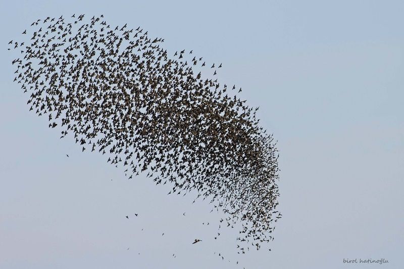 Fotoğrafın alt kısmında görülen yırtıcı gök doğan .. Bu karenin aynısını memelilerde , balıklarda ve diğer canlılarda da izlemek mümkün.Sürü oluşturarak kendilerini avcılara karşı koruyorlar. Tabii ki sürü oluşturmanın bazı canlılar ve bunlara kuşlar da dahil olmak üzere yaşamsal bir çok avantajları da vardır.. Bu karede sığırcıklar gökdoğanın kafasını karıştırmak için epeyce gayret gösterseler de doğan istediğini alıp gitti.. Kızılırmak deltası.