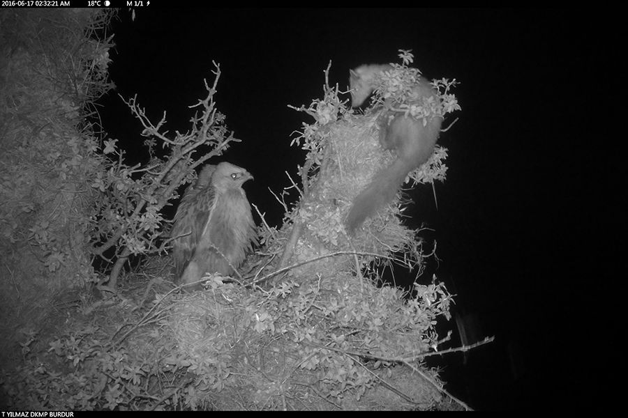 Bir çalışma kapsamında Burdur\'da bir çift kızıl şahin yuvasının yakınına yerleştirdiğim fotokapan ile onları yumurtadan itibaren takip ediyorum. Yavrular şu anda bir aylıktan birkaç gün fazla oldular. Uçmak üzereler yani. Aslında gece ışıktan rahatsız olmamaları için gece çekimi kapatmıştım ama sadece videoyu kapatmışım bu yüzden bir miktar gece fotoğrafı da çekmiş. Gece fotoğraflarında yavruların yumurtadan çıkmasından itibaren sıklıkla bir kaya sansarı sürekli tacizde bulunuyor. Tabi bu taciz belki direkt olarak bu türe olmayabilir. Çünkü yuva çevresinde bol miktarda ağaç serçesi de yuva yapmış ve bunlardan da hem şahinler hem de sansar yararlanıyorlar. Yavrular bazen yalnız kalıyor geceleri,ebeveynleri gelmiyorlar. Özellikle şu aralar. Ama gerçekten iyi mücadele edip kendilerini koruyabiliyorlar. Bu kare de taciz anlarından birisi...