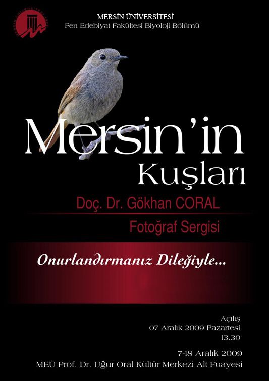 Mersin Üniversitesi Fen Edebiyat Fakültesi Biyoloji Bölümü etkinlikleri kapsamında düzenlenen \"Mersin\'in Kuşları\" adlı fotograf sergisininde siz doğa dostu arkadaşlarımızı aramızda görmekten mutluluk duyarım.