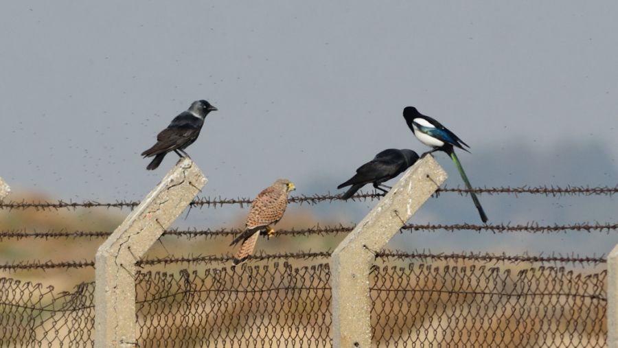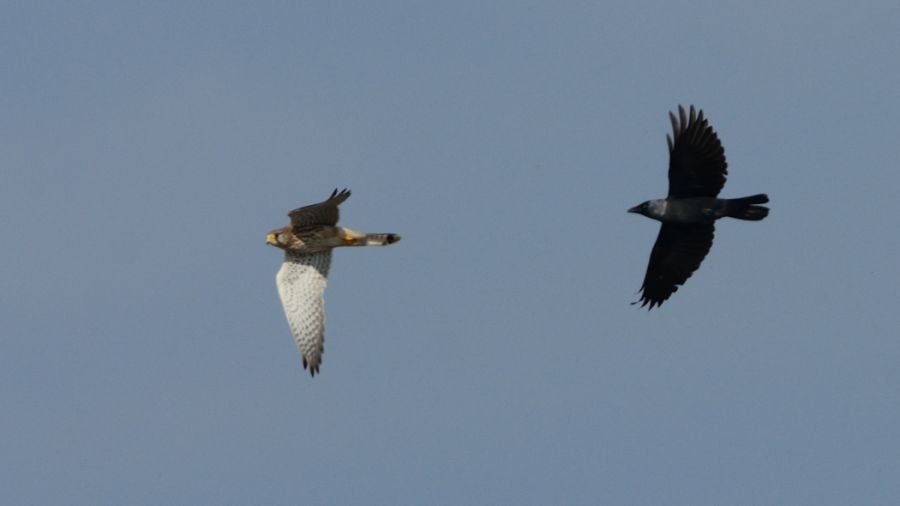 Değişik bir örnek, fotoğraftaki Kerkenez\'i kovalayan Küçük Karga oldu. Kovalamaca birkaç dakika devam etti. Bir süre sonra bir saksağan da kargaya katıldı, Kerkenez\'i kovalamaya birlikte devam ettiler. Yorulunca da ikinci resimde olduğu gibi tellere konup birlikte dinlendiler.
