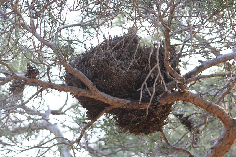 Bugün (01.01.2010) Çanakkale\' nin güneyinde çam ormanı içerisinde bir vadide kayalık bir sırtın üzerindeki çam ağacının üstünde bu yuvayı gördüm. Deniz seviyesinden 400-500m yukarıda olan bu bölgedeki yuvanın hangi kuşun yuvası olabileciğini sizlerden öğrenmek istedim. Boyutunu iki kolunuzu açtığınızda yuvanın yarısını sarabileceğiniz bir şekilde düşünebilirsiniz. Fikrini söyleyen arkadaşlara şimdiden teşekkürler.