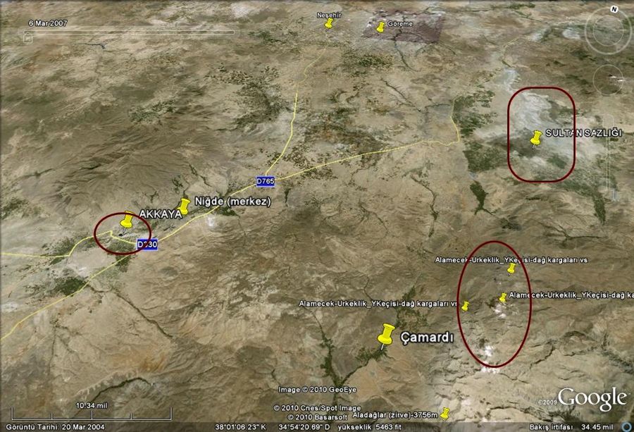 TRAKUŞ Kamp alanı olarak Sultan Sazlığı; alternatif günü birlik gezi-gözlem alanları için Akkaya ve yüksekdağ (alpin) kuşları ve yabankeçisi için Aladağların konumunun gösteren Google Earth haritası (ölçek, mil olarak verilmiştir).