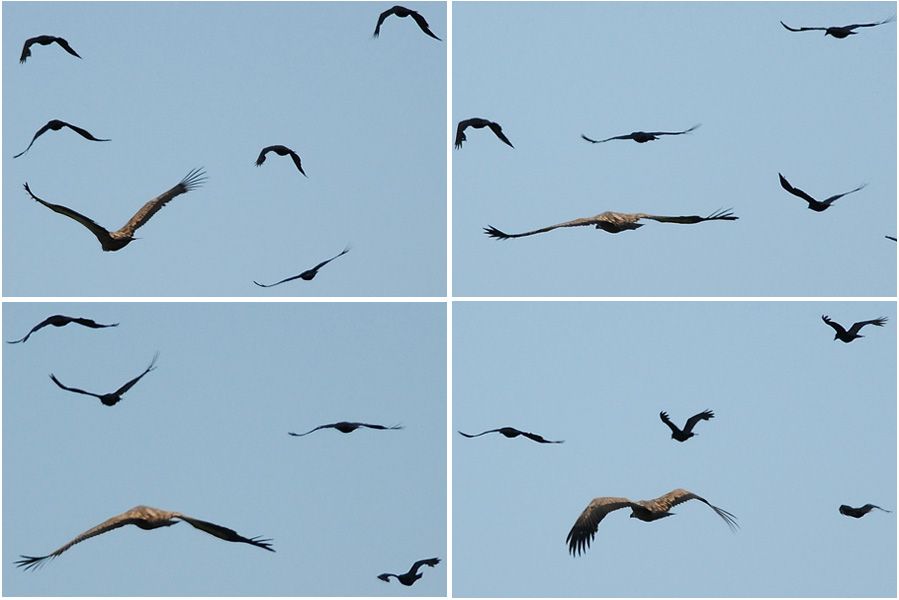İlerden bir grup kuşun geçtiğini gördüm. Aralarından biri oldukça heybetliydi. Tacize aldırmadan, istifini bozmadan alçaktan uçuyordu. Tacizci grup kuzgunlar. Aradaki boyut farkı etkileyici, kuzgunun kanat açıklığının 120 cm olduğu düşünülürse. Ümit Abinin bu sene göçte az geçtiler dediği kuş.
