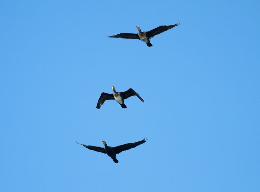 Manavgat, deniz kenarı...Bu sabah...Koskoca gökyüzünde bir arada uçan bu üç silahşörler karabatak mıdır? üçünün de göğüs renginin birbirinden farklı olduğu dikkatimi çekti...