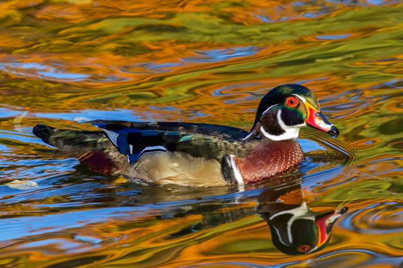 Karolin Ördeği, Woood Duck (Erkek) Ekim 2012'de; Canada, Toronto High Park'da, (sonbaharın yaprak renklenmeleri suya vurunca)
