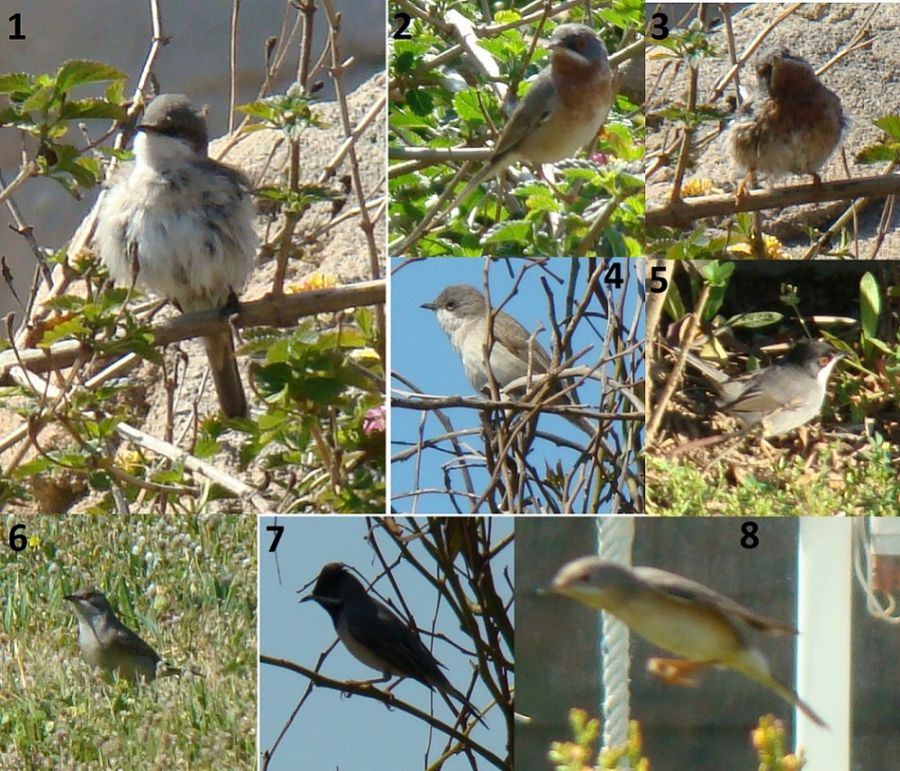 Antalya Lara Plajlar Bölgesi\'nde, yolun üst tarafında kum-çamlık alanın içerisinde; gri leş kargaları baskınlığı altında, tepeli toygarlar, karatavuklar, ibibikler, büyük baştankaralar bulunmaktaydı. Yolun deniz tarafına geçtiğimde etrafımda onlar ile ifade sarıkuyruksallayan sürüsü uçuşuyordu. Bulunduğum yerde bir sürü ötleğen vardı: 1 ile 3 aynı çalıya bir kaç dakika ara ile geldiler. 2\'nin yetişkin, 1 ile 3\'ün genç Bıyıklı Ötleğen olduğunu düşünüyorum. 4 ile 6 Akgerdanlı, 5 Maskeli, 7 Kara Boğazlı Ötleğen olmalı diye, ustaların yorumlarını rica edeceğim. 8 ise çalılıktan kalkarken tanımsız...