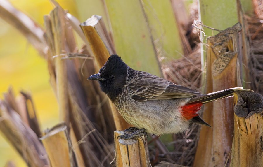 Bizim Arp Bülbülünün, Arap Versiyonu; Red-vented Bulbul (Pycnonotus Cafer), Kuyruk sokumu kırmızı, sırt, kanat ve göğüs koyu ve alacalı. Dubai\'den...