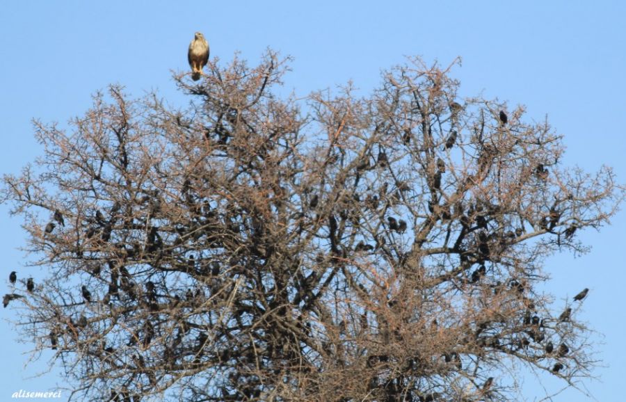 kızılşahinle sığırcıkların muhteşem dostluğu... yüzlerce sığırcık ve tek kızılşahin... selamlar..