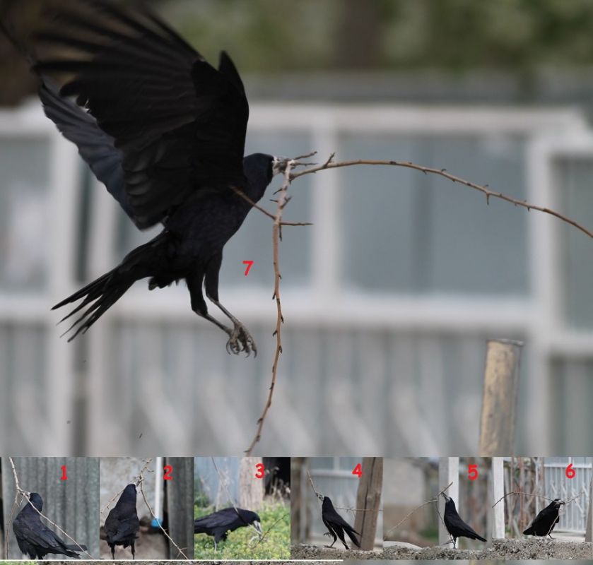 Azimli \"Ekin Kargası\". Yuvasına taşımaya karar verdiği dal parçasının ağırlık merkezini bulak için bayağı bir deneme-yanılma çalışması yaptı. 7. hamlede uçuşa hazırdı.