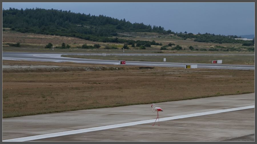 İzmir Adnan Menderes Havaalanı 06.06.2014 Sabah 08:15 . Taksi yolunda bir Flamingo... Sanıyorum yorgunluk ve kötü hava şartları zorladı sürüsünden ayrılarak tehlikenin göbeğine sığınmayı. Hemen sevgili Karddeşim K.azım Çapacıyı aradım, Hocam, İzmir bölgesinde ilk flamingomu fotoğrafladım diyerek... :)