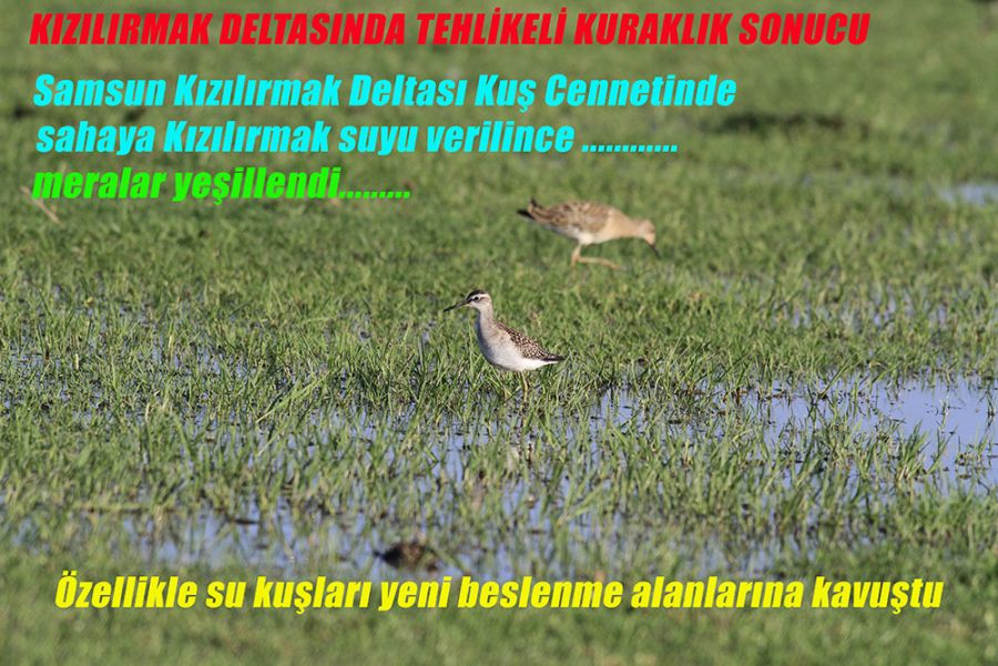 Samsun Kızılırmak Deltası Kuş cenneti kısmında... örneğin kuşçuların uğrak yeri cernek gölünde seviye 1.5 düşünce.. Özellikle kuşların beslenme alanı olan sarıkamış tamamen kuruyunca.. DSİ kanallardan yarma yaparak sahaya Kızılırmak suyu verdi. Nehir suyu kimyasal gübre nedeni ile uygun değil ama.. kuraklık tehlikesi çok daha büyük. Sonuçta meralar 15 günde yeşerdi... Özellikle küçük su kuşları yeni besinli sulak alanlarda beslenmeye başladı.. Bu fotoğraf sahaya girilerek çekilerek tespit yapıldı.