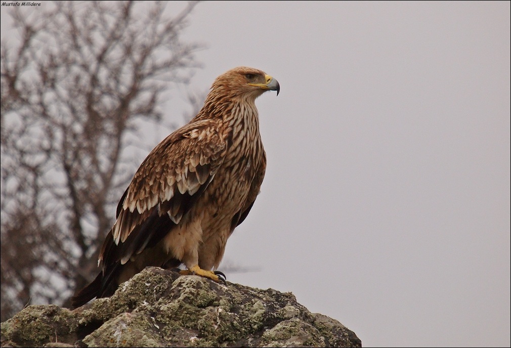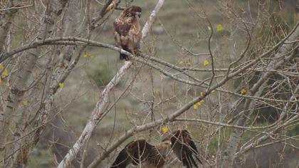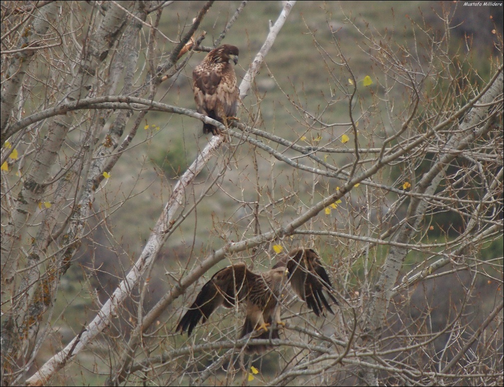 hava kapalı olduğu için yırtıcıların hepsi yerdeydi. bol miktarda kara akbaba karşımızdaki yamaca, şah kartallar ağaçlara tünemişlerdi. yere yakın bir uçuşla önümüze gelip konan kaya kartalıyla şok olduk. biraz dikkatli bakınca yakın bir ağaca şah kartalla aynı ağaca tünemiş akkuyruklu kartalla iyice şok olduk. tam üç tane akkuyruklu saydım, hepside genç ve çok güzel görünen bireylerdi. dağ taş yırtıcı kaynıyordu. şahlar daldan dala zıpçırıyor, birbirlerini kakuçluyorlardı. enfes bir görüntüydü. ilk başta Menderesin dürbün taşımamasını çok yadırgadım, fakat haklıymış, ihtiyacı yok, herşeyi görüyor. nasıl gördü anlamadım ama uzaktan yerde tünemiş olan şah kartalı farketti, bizi ikaz etti, işaret ettiği yerde hiç birşey göremedik. fakat Menderesin yönlendirmeleriyle, hiç birşey görmememize rağmen, itinalı bir şekilde ilerlemeyle kuşun tam yanına kadar gittik. öncelikle komposizyon denemeleri yaptık, ve sonra biraz daha yaklaştık. Menderes o kadar ustaydı ki, portre mi çekelim, uçar karelerimi alalım diye tartışalar bile yaptık. uçar kareleri için biraz uzaklaştık ve istediğimiz muhteşem uçar karelerini aldık. ne diyeyim Menderes, Allah gönlüne göre versin, böyle kareler alacağımızı bilseydim seneler önce gelirdim, çok sağol...