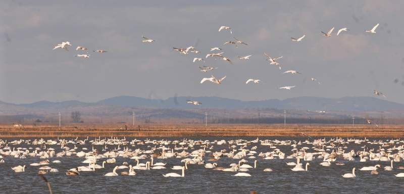 YER GÖK KUĞU....sabah hava çok köyüydü..yağmur ve ışıksızlık vardı...yenikarpuzludan ovaya inerken büyük bir boz kaz sürüsü kuzeye doğru uçtular... gala ya doğru ilerleyince çeltik alanlarının tamamı su ile kaplanmıştı...biraz ilerleyince sağlı,sollu tüm çeltik alanları kuğular ile doluydu...bu güne dek böyle birşey görmedim...sanki kuğu denizi....hava soğuk... fotoğraf çok zor ...ama belge olsun diye cekiyorum...gala gölünden giriş bölümüne gelince göle saptım..yine iki tarafra kuğular ile dolu...ama göle ilerleyemedim yol yağmur nedeniyle iyice çamur olmuştu...geri yola çıkıp göl boyunca eneze vardım...lagünlere gittim...burada flamingolar tam rengini almışlardı ama uzaktı...bahriler girip çıkıyordu...birda siyah beyaz gözleri altın sarısı üç dalıp çıkan kuş daha gördüm..kitaba baktım karar veremedim onun için gözleme işlemedim...öğlen yemeğini özkan lokantasında yiyip tekrar yola çıktım...hava hiç ısınmadı ama öğle üzeri güneş kendini göstermeye başladı...kuğu manzaraları şahaneydi...hele akşam uçuşları görülmeye değerdi....sevgilere...