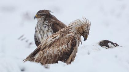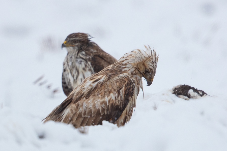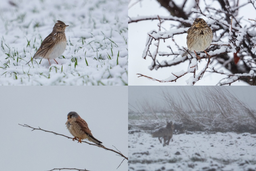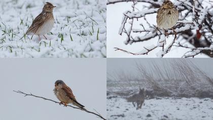 Kar yağışlı 0 derece, her yer ince bir tabaka kar kaplı. Şahinler ıslak e aç gibiler, tarlakuşları ve tarla kirazkuşları çok ve karın üzerinde yemleniyorlar, Paçalı uçmasa idi 3 şahin türü aynı karede olacaktı.