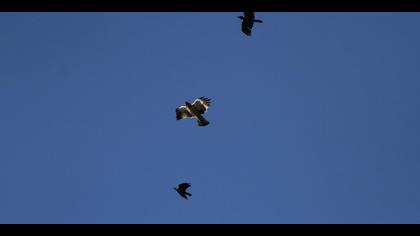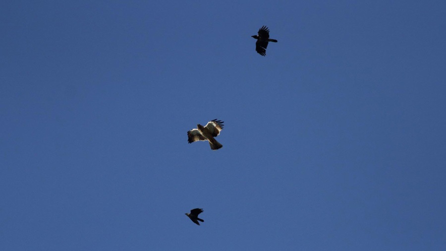 Yamacın sonundaki düzlüğe daha ilk adımlarımda önümden irice bir gölge kayıyor. Güneşe doğru döndüğümde cesur birkaç karganın iri bir yırtıcıyı yaşadıkları bölgeden uzaklaştırma çalıştıklarını görüyorum. Göç yorgunu bir Küçük kartal bu, kargalar peşinde batı sırtını kaplayan ağaçların arkasında gözden kayboluyor.